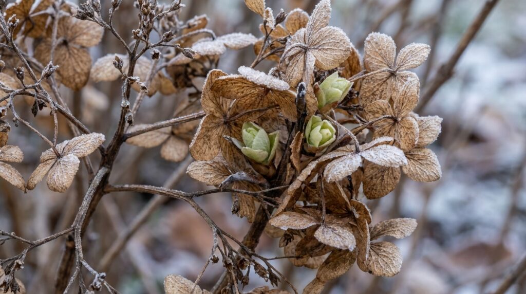 Det du kaller avfall, er plantens egen vinterfrakk. De gamle blomsterstandene danner et luftig isolasjonslag som demper vind og fanger tørr luft. Like under disse hodene sitter kommende sesongs knopper, tettpakket med fremtidige blomster. Ved å la toppene stå, skaper du et naturlig lokk som reduserer temperatursjokk og holder fukt unna sarte vev.