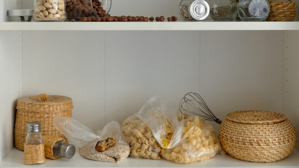 Noen huseiere gjemmer pantryet sitt bak en dør, men hvis du er en ambisiøs interiørdesigner, kan du velge åpne hyller i stedet. Denne ideen krever litt organisering. Ethvert pantryrot blir raskt et øyesår som er synlig fra hvor som helst på kjøkkenet ditt – eller lenger unna hvis du har en åpen planløsning. Hvis du går denne veien, er det ting du kan angre på å organisere på åpne hyller, for eksempel gamle hvitevarer, rengjøringsprodukter eller skjøre servise som er utsatt for å gå i stykker hvis det faller. Du kan legge førstnevnte i skap for å skjule dem. Hvis sistnevnte er fin, vil du vise dem. En måte å holde dem beskyttet på (og legge til litt pizza i pantryhyllene samtidig) er å montere håndklestenger som hyllebeskyttere.